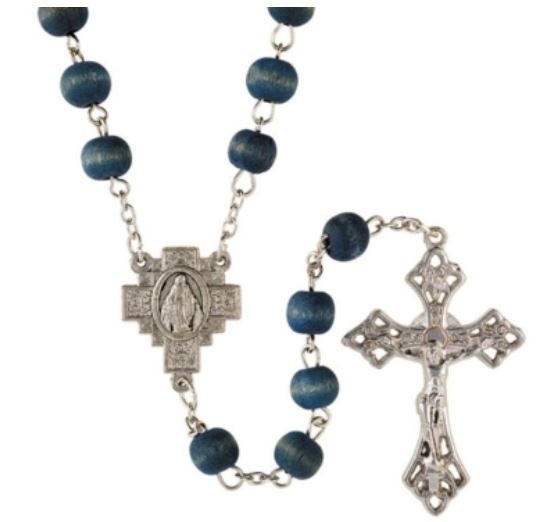 Available: In Stock Rosary - Blue Wood (Scented) - Each rosary is durably crafted of blue wood beads, a Madonna cross centerpiece and an ornate crucifix. The blue wood beads are scented. Material: Rose Scented Wood/Zinc Alloy Size: 7 mm Bead, 21" L, 1-3/4" Crucifix