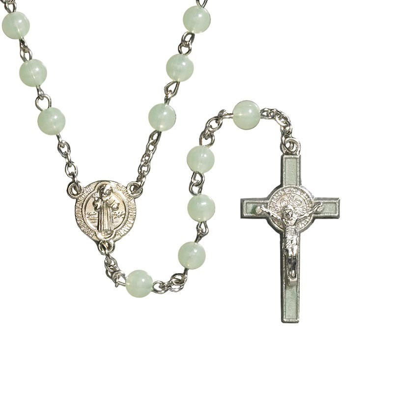 Available: In Stock Rosary - Luminous St. Benedict - This rosary features luminous beads, a St. Benedict centerpiece and St. Benedict crucifix. Material: Moulded 6 mm Bead Size: 19" L, 1 1/2" Crucifix
