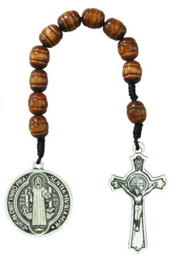 Available: In stock. Pocket Rosary - St Benedict - The St. Benedict one decade rosary is perfectly sized to carry in your pocket or purse and it comes with carved wood beads, a metal St. Benedict Medal centerpiece and crucifix. The medal helps to ward off evil, poison, and temptation. Material: Wood/Cord/Zinc Alloy Size: 9" L
