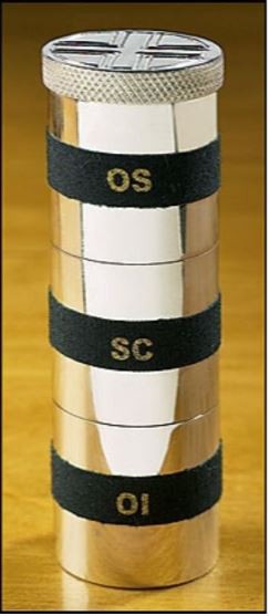 Availability: By Special Order This Oil Stock is used to hold Holy Oil or Chrism Oil and is made of stainless steel with a cross engraved on the top. It is labelled OS for Catachumens, OI for the Sick, and SC for Baptism. Crafted in Italy. Material: Stainless Steel Size: 3-1/2" H