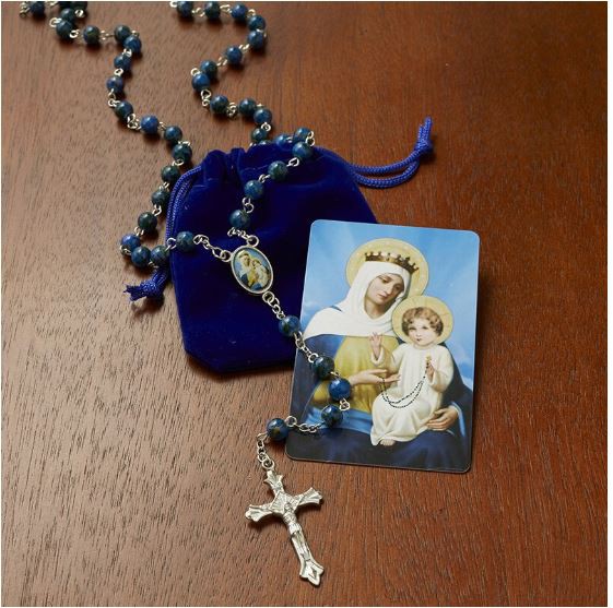 Available: In stock. Rosary - Our Lady of the Rosary - This beautifully styled rosary features marbled blue glass beads, Our Lady of the Rosary medal centerpiece and a traditional crucifix. Each rosary comes with a holy card with a prayer on the back and a velvet case. Material: Glass/Epoxy/Zinc Alloy/Velvet Size: 6 mm Bead, 19-1/2" L, 1-1/2" Crucifix