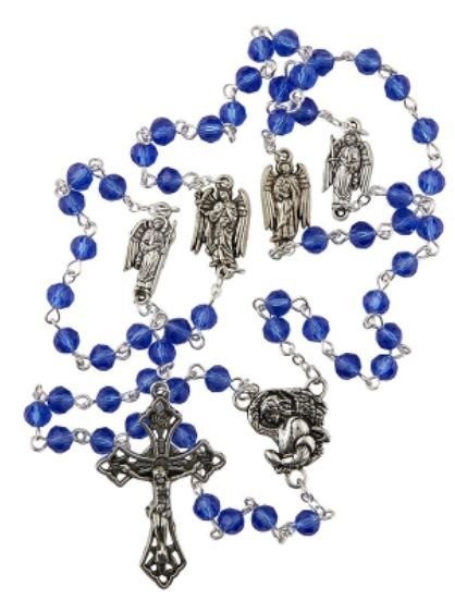 Available: In Stock Rosary - Archangel - This rosary is beautifully crafted. It features blue glass beads, Archangel medals, a Archangel centerpiece and traditional crucifix. Material: Glass/Zinc Alloy Size: 6 mm Bead, 21" L, 1-3/4" Crucifix