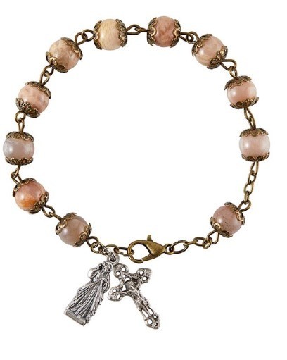 Availability - In Stock Bracelet - Divine Mercy Rosary - This bracelet features a crucifix, Divine Mercy medal dangle and brown stone beads with gold finish double-caps. Material: Stone /Zinc Alloy Size: 8 mm Bead, 7" L with Lobster Clasp, 1/2" Dangles