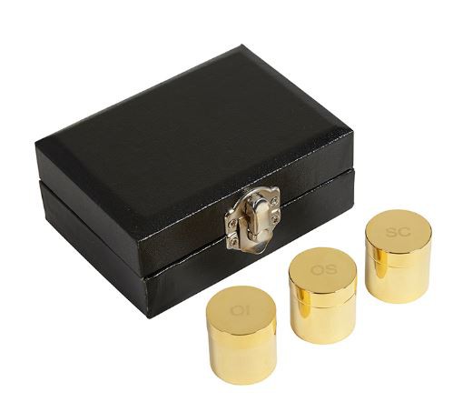 Availability: By Special Order Triple Holy Oil Stock Set with Case - Polished Brass- This oil stock set includes three polished brass oil stocks inscribed with OI (Oil of the Sick), SC (Holy Chrism) and OS (Oil of the Catechumens) on the lid. Includes a convenient storage carrying case. Material: Polished Brass Size: 4 x 1-1/2 x 3" D Case