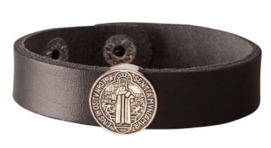 Available: In Stock Bracelet - St. Benedict - This bracelet is made of a leather band with a St. Benedict medal as the centerpiece. This devotional bracelet is perfect for men or women with a devotion to St. Benedict. Material: Leather/Silver Plate Size: 8-1/2" Adjustable