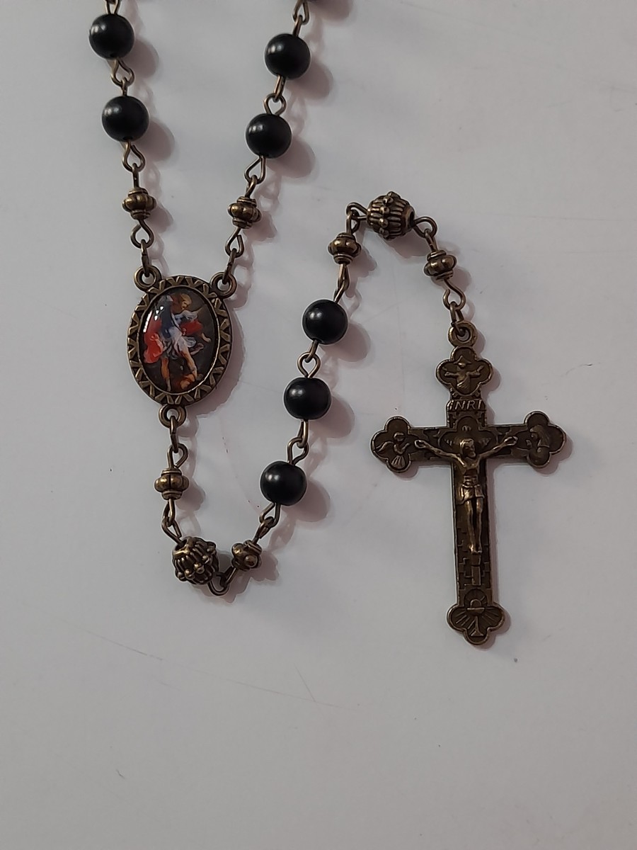 Available in Stock: Rosary - St Michael Ornate It is a wonderful gift as St. Michael is known for protection, especially from lethal enemies. He is also the patron of soldiers, police and doctors. Material: Bead/Cord Size: 8 mm Bead, 15" L, 1-7/8" Crucifix