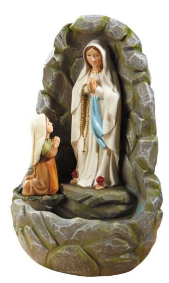Availability: By Special Order Our Lady of Lourdes with St Bernadette Grotto Holy Water Font - This holy water font is crafted of durable resin and features Our Lady of Lourdes grotto image. Having a font in your home is a great way to store holy water for blessing yourself as you leave or enter your home or before going to bed. Material: Resin Size: 6" H