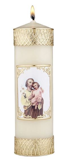 Availability: In Stock. Candle - St Joseph and Child - This beautifully detailed devotional candle is hand-decorated with a metallic gold wax and features an image of St. Joseph and Child. Material: Wax Size: 2-1/2" x 7-3/4" H