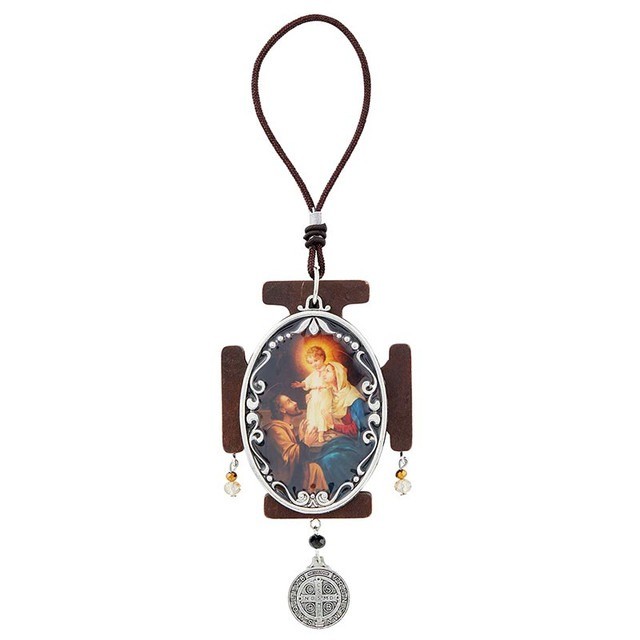 Available: In stock. Holy Family - Home Protection Hanger - This Protection Hanger features a large medal of the Holy Family, a St. Benedict medal and small dangle beads. Great for a house-warming gift to hang on a doorknob, wall / entrance or bed post. Material: Zinc Alloy/Wood/Cord Size: 5" H 5" L