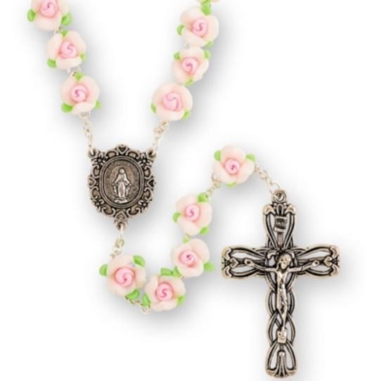 Available: In Stock Rosary - Rose Beads - This rosary is uniquely crafted of fimo clay beads, a Marian centerpiece and an ornate crucifix. Material: Fimo Clay/Zinc Alloy Size: 10 mm Bead, 19-1/2" L, 1-7/8" Crucifix