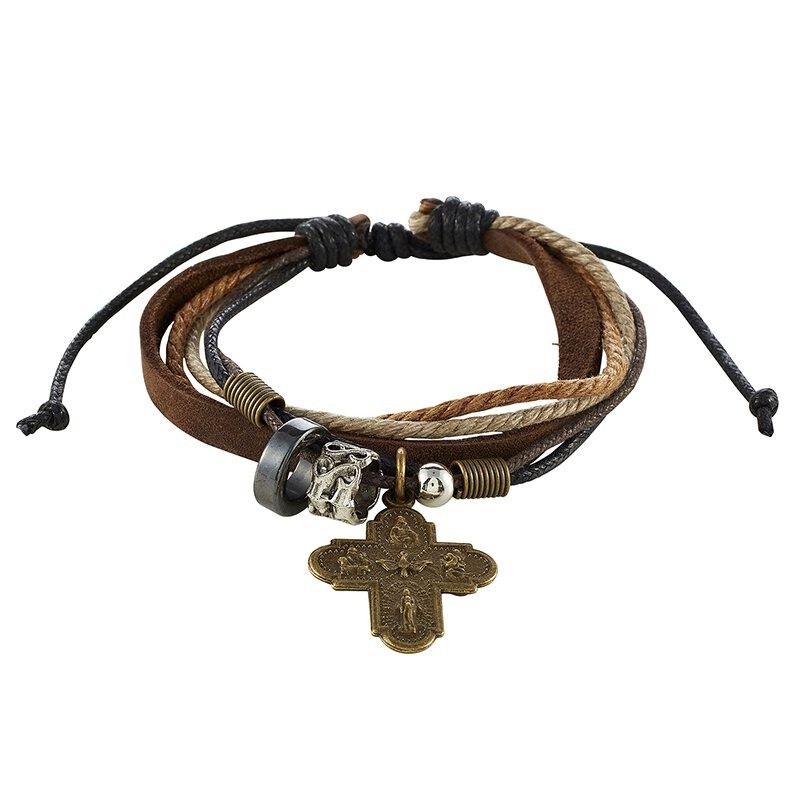 Available: In Stock Bracelet - Four Way - This adjustable leather, multi-strand bracelet comes with various small charms and one large four way medal. Material: Zinc Alloy/Cord/Leather Size: 8" Adjustable
