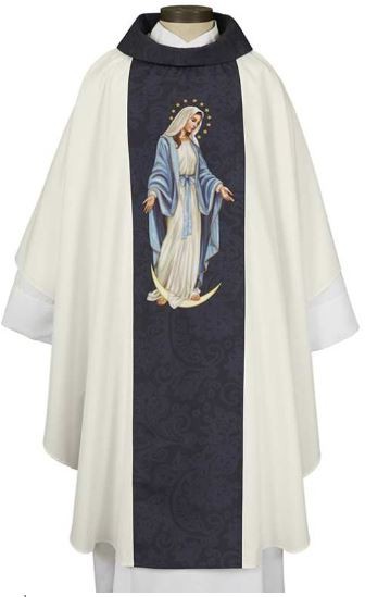 Availability: By Special Order This Chasuble with cowl neck features a digitally printed sacred image of Our Lady Of Grace. Material: Polyester Size: 59 x 51" L