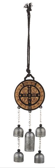 Available: By Special Order Door Hanger - Ward off evil and gain an added sense of peace at your home with this beautifully designed St. Benedict Door Hanger with Bells. This will make a wonderful gift featuring an intricately crafted double sided St. Benedict medal wood centerpiece for anyone with a special devotion to St. Benedict. Material: Zinc Alloy/Wood/Cord Size: 12" L