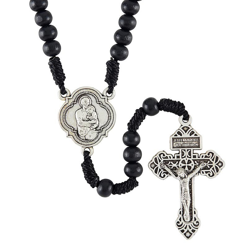 Available: In Stock Rosary - St. Joseph Wooden - This rosary features black wood beads, a St. Joseph with Child centerpiece and a crucifix. This is a perfect gift for fathers and those with a devotion to St. Joseph Material: Wood/Cord Size: 8 mm Bead, 16" L, 2-1/8" Crucifix