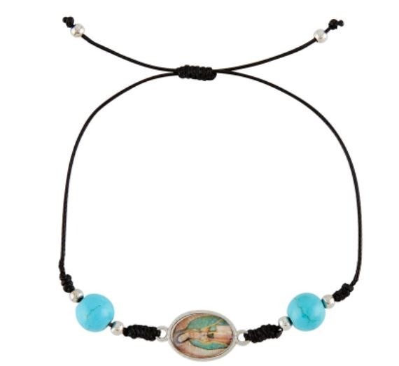 Available: In Stock Bracelet - Turquoise Beads - This bracelet features Our Lady of Guadalupe centerpiece adorned by 2 faux turquoise beads on each side. The bracelet is adjustable to fit various wrist sizes. Material: Cord/Epoxy Size: 8mm Bead, 7-1/2" L Adjustable