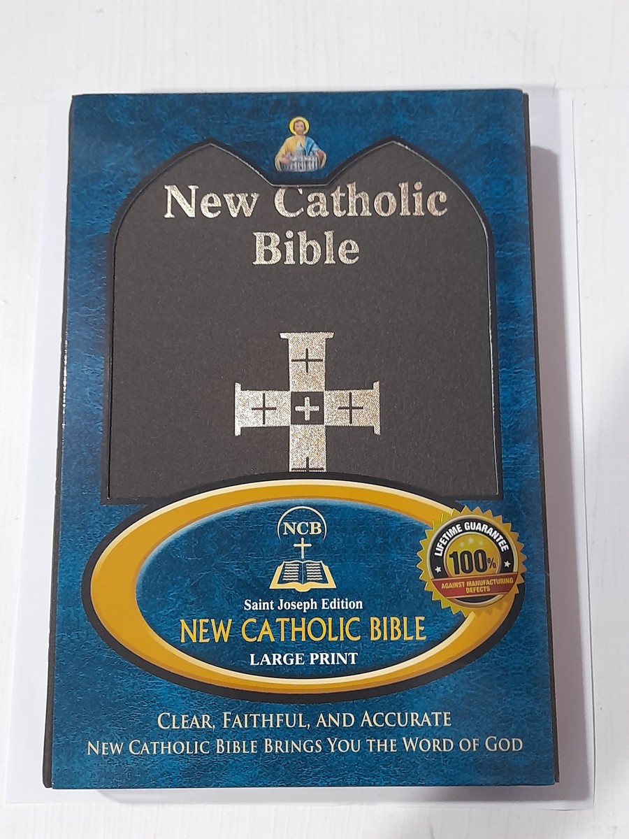 Availability: In Stock Book - New Catholic Bible - Large Print - This Bible has distinctive features such as large easy to read typeface, words of Christ in red, footnotes and cross-references keyed in text, over 30 self-explaining maps in context and pages to record family tree and marriages. Material: Paper/Vinyl Cover Size: 5-1/2 x 8" H