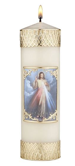 Availability: By Special Order Candle - Divine Mercy - This beautifully detailed devotional candle is hand-decorated with a metallic gold wax and features an image of Divine Mercy. Material: Wax Size: 2-1/2" x 7-3/4" H