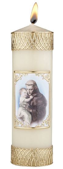 Availability: By Special Order Candle - St Anthony - This beautifully detailed devotional candle is hand-decorated with a metallic gold wax and features an image of St. Anthony. Material: Wax Size: 2-1/2" x 7-3/4" H