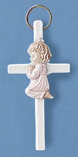 Available: In stock. Cross - Wall - Praying Girl - This adorable wall cross is crafted of glazed porcelain and comes with a loop for hanging on a wall or crib. It makes a perfect gift for Baptisms. Material: Porcelain Size: 5-1/2" H