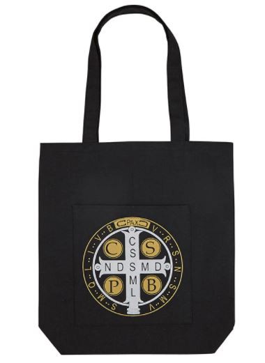 Availability: In Stock Tote Bag - St. Benedict - This canvas Tote Bag displays the St. Benedict medal which is one of the oldest and most honored medals. The Tote Bag is designed for carrying heavier items, it's durable and includes a long handle for comfort as well as a large front pocket for keeping track of smaller items. Material: Canvas Size: 13 x 14" H with 3" Gusset