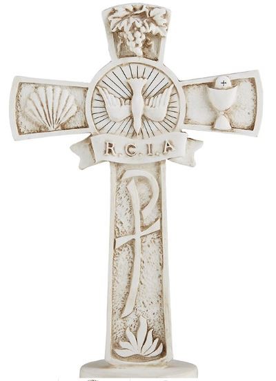 Availability: By Special Order Cross - RCIA Standing Cross (6 1/2") - This RCIA standing cross features a beautiful RCIA symbols etched on a cross and the verse, Isaiah 43:1, on the back of the cross. Material: Resin Size: 6-1/2" H