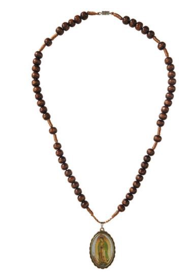 Available: In Stock Rosary - Our Lady of Guadalupe - This rosary features a wooden bead necklace with Our Lady of Guadalupe Pendant. Material: Wood/Zinc Alloy/Epoxy Size: 1-1/2" Pendant, 20" L Cord