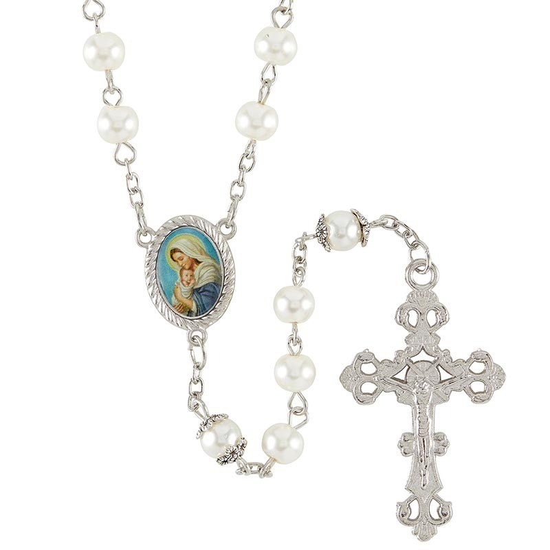 Available: In Stock Rosary - Mother Mary Pearl - This rosary features glass pearl beads, double-capped Our Father beads, Mary with Jesus centerpiece and crucifix. This is a perfect gift for mothers and those with a devotion to Mary the Mother of Jesus. Material: Glass Pearl/Zinc Alloy/Epoxy Size: 6 mm Bead, 20" L, 1-3/4" Crucifix