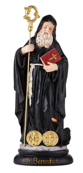 Availability: In Stock Statue - St. Benedict - This Statue depicts the beloved St. Benedict holding a book and crozier. It also features the front and back of the St. Benedict coin at the foot of the Saint. Devotion to St. Benedict is celebrated on July 11th. Material: Resin Size: 12" H