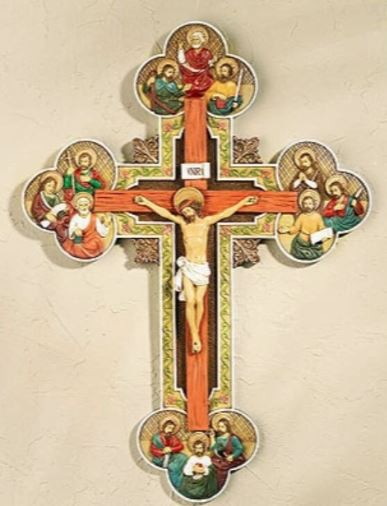 Availability: By Special Order Crucifix - Twelve Apostles (13") -This unique crucifix is a wonderful gift. It portrays Jesus surrounded by His Twelve Disciples. This hand painted crucifix reminds us we are called to bear witness to Jesus' Paschal Mystery. Material: Resin Size: 13" H