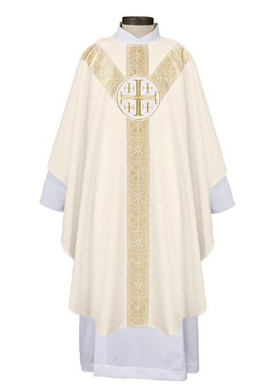 Availability: By Special Order The Semi-Gothic Chasuble comes in white to celebrate liturgies and is handcrafted with great detail using premium crosshatch woven fabric and features exclusive design. Material: 100% Polyester with Banding Size: 59 x 51" L
