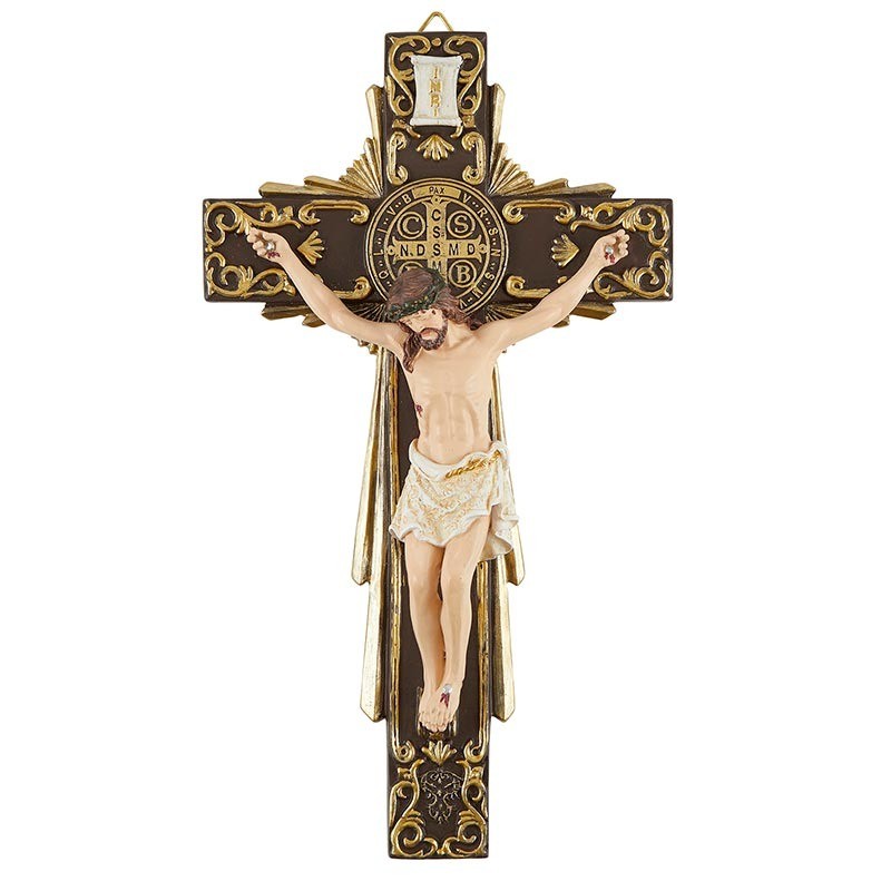 Available: In Stock Crucifix - Decorative St. Benedict - This decorative St. Benedict crucifix features a brown cross with the St. Benedict medal along with gold accents. Material: Resin Size: 11-3/4" H