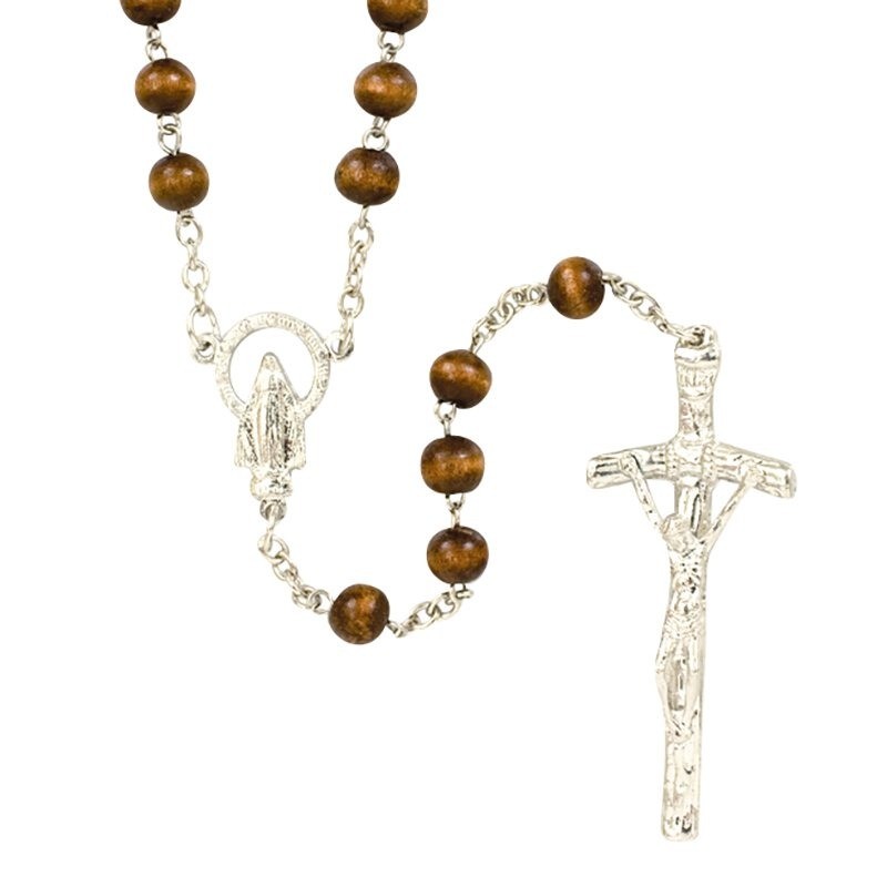 Available: In Stock Rosary - Papal - This rosary is crafted with brown wood beads, a Marian centerpiece and a papal crucifix. Material: Wood 7 mm Bead Size: 18" L, 2 1⁄4" Crucifix