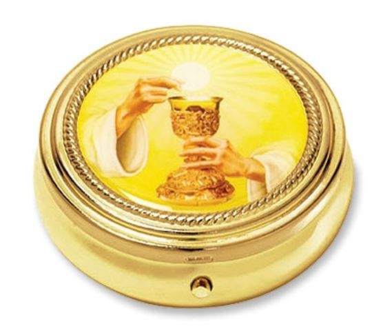Availability: In Stock. Pyx - Chalice - Carry your consecrated hosts in this Chalice pyx with an epoxy lid on your visitation to the sick or infirmed. This vessel holds up to 10 hosts and has a fitted closure providing a barrier to dirt and moisture. It is polished gold tone with the artwork of the Chalice. Material: Gold finish/Epoxy Size: 2-1/4 ", 3/4" D