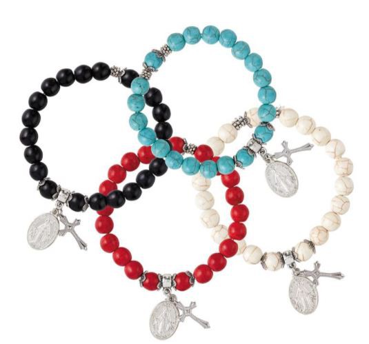Availability: In Stock Miraculous Medal Bracelet - These colourful bracelets come with a Miraculous medal and cross dangle. Choose from an assortment of colours: white, black, red and blue. The bracelets are stretchable so it can be worn by anyone. Material: Faux Stone/Zinc Alloy Size: 7" Stretchable
