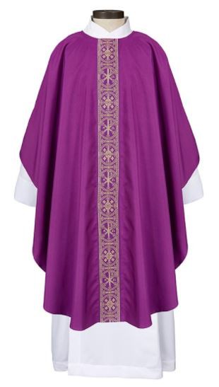 Availability: By Special Order This Chasuble comes in purple to celebrate sacred liturgies and is handcrafted with great detail using premium crosshatch woven fabric and features exclusive design. The chasuble includes a matching stole. Material: 100% Polyester with Banding Size: 59 x 51" L
