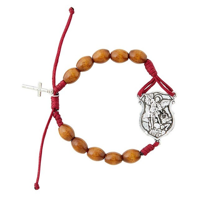 Availability: In Stock Bracelet - St. Michael Shield - This adjustable bracelet features a St. Michael shield medal, crucifix dangle and wooden beads. Material: Zinc Alloy/Wood/Cord Size: 8 x 10 mm Bead, 7", 1-1/4" Medal, 5/8" Crucifix Dangle