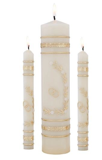 Availability: By Special Order Wedding Unity Candle Set - Flowers and Rings - This wedding unity candle set features stunning symbols hand crafted by artisans from pure wax that is coated with gold and silver leaf. Set includes (1) 2-3/4 x 11-1/4" pillar candle and (2) 7/8 x 10" taper candles and is packaged in a keepsake box for easy storage. Material: Wax Size: (1) 2-3/4" D x 11-1/4" H Pillar Candle, (2) 7/8" D x 10" H Taper Candles
