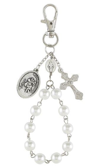 Available: In stock. Traveler Clip - St. Christopher - This traveler clip includes a one decade pearl rosary, St. Christopher Medal and crucifix dangle with lobster clasp. Material: Glass/Zinc Alloy Size: 8 mm Bead, 5" L, 1-1/4" Crucifix