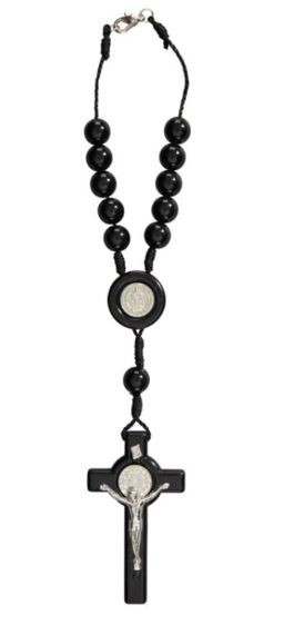 Available: In stock. Auto Rosary - St Benedict - Our beautifully crafted rosary features the St. Benedict Medal containing symbols and text related to the life of Saint Benedict of Nursia and a silver metal corpus crucifix with a lobster-clasp closure. Material: Moulded/Zinc Alloy/Cord Size: 8 1/2" L